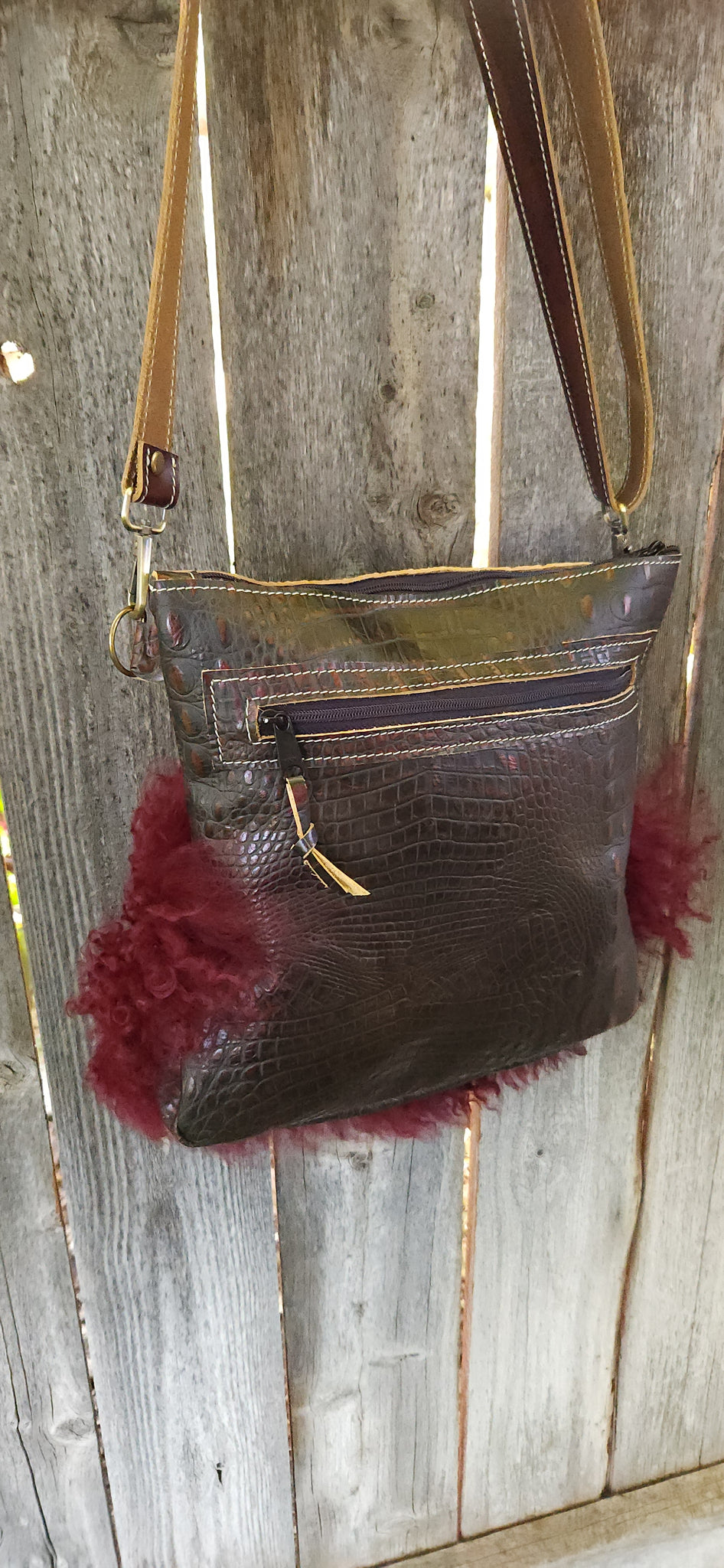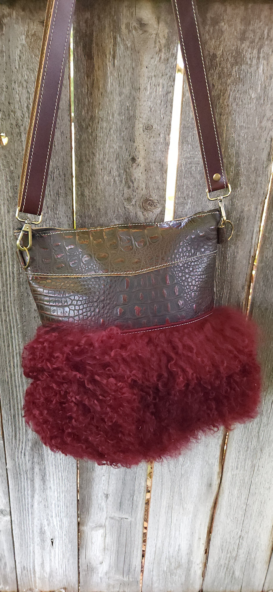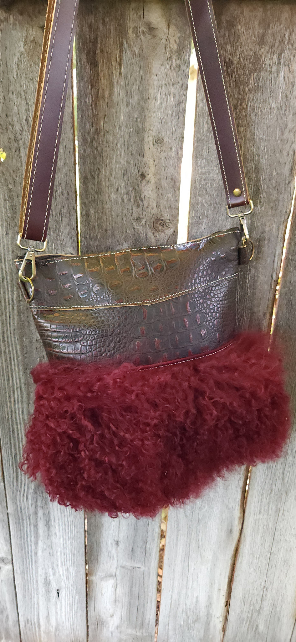 Hand Crafted with Tibetan lamb and embossed leather. A large back slip pocket, it is lined with a slip pocket and a zipper pocket and has it has an adjustable leather shoulder strap.