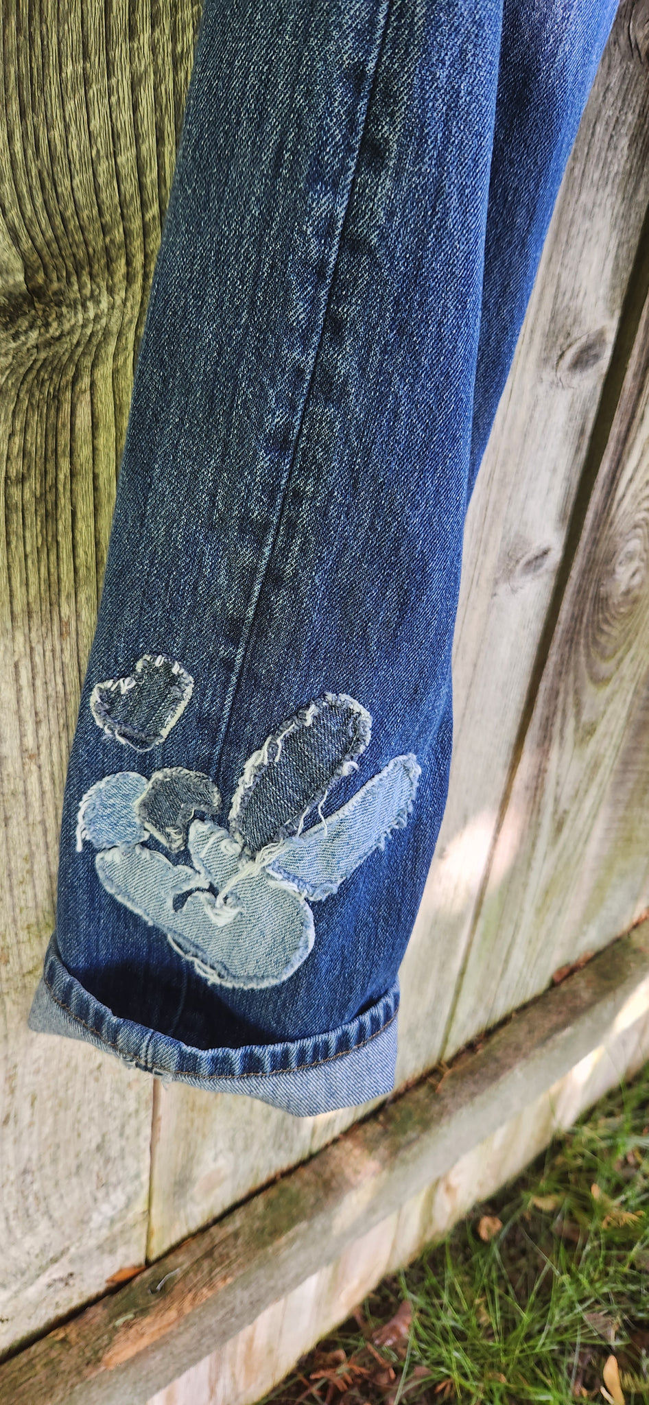 This vintage inspired Levi 501's combines cozy comfort of lived in jeans with a touch of whimsy applique featuring soft worn denim. This is a great stylish look for out on the town, going to concerts or lounging on your pourch.